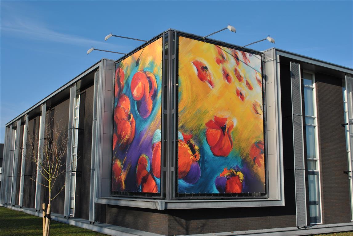 De Evangelische Gemeente ‘De Schuilplaats’ in Ede biedt haar kerkgangers een ruimte waar men zichzelf kan zijn en waar rust en kunst samengaan. In samenwerking met kunstenares Anja Winkel is een schilderij van een bloemenregen op groot formaat uitgewerkt. Niet alleen binnen, maar ook buiten (weerbestendig) is het kunstwerk als duurzame, opvallende hoekpui te zien. Uit dit project blijkt hoe leuk een samenwerking tussen kunstenaars en Van de Pol Reclame kan uitpakken. Een kunstproject is dus altijd uit te voeren. De op maat gemaakte constructie van stalen frames, het gefotografeerde kunstwerk, de speciale lichtbakken, het gekozen spandoek én de symbolische uitstraling passend bij dit pand bevestigen dit maar weer eens. In het geval van ‘De Schuilplaats’ heeft dit kunstwerk een waar glas-in-lood effect weten te creëren!