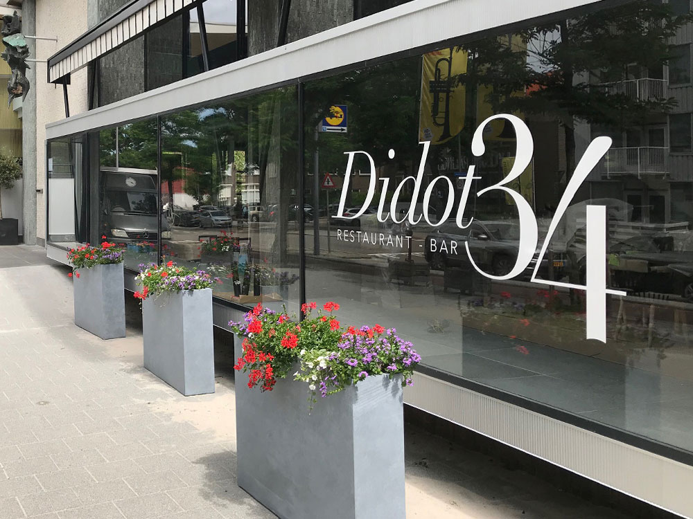 Op diverse ramen zijn met witte folie logo’s geplakt. Dit om het restaurant en de bar goed kenbaar te maken.